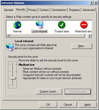 3.      Set Local Intranet zone to Default Level by pressing corresponding button.